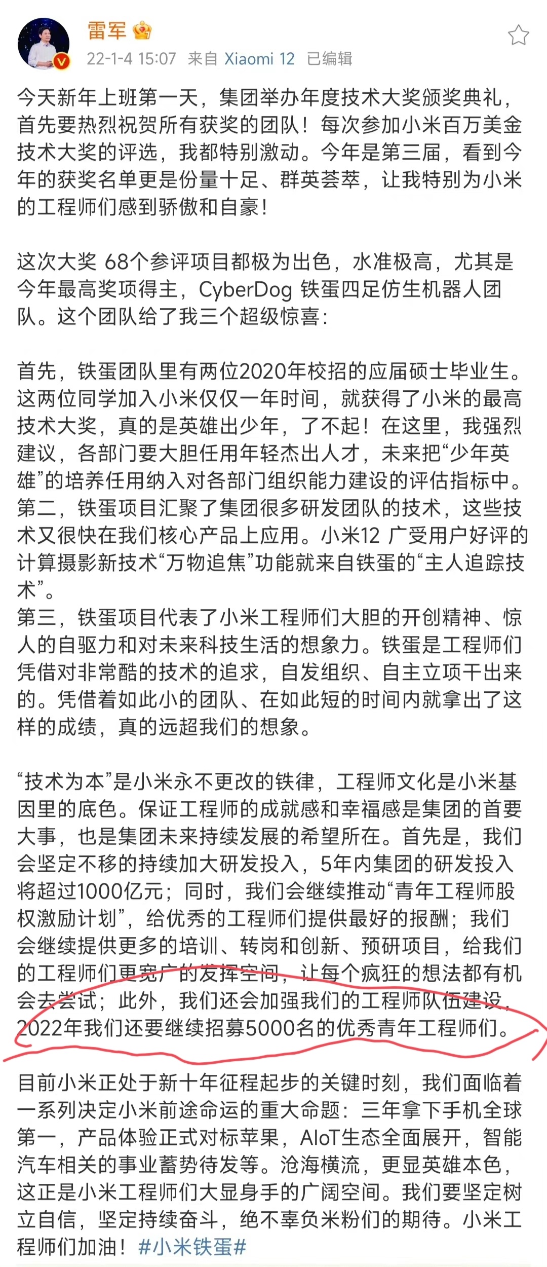 很多人認為這個消息有談資的重要依據,是小米雷軍年初剛剛宣佈2022年要招募5000名年輕工程師。沒想到到年底卻要裁員這麼多人,這種劇烈的反差,引發網友的議論。