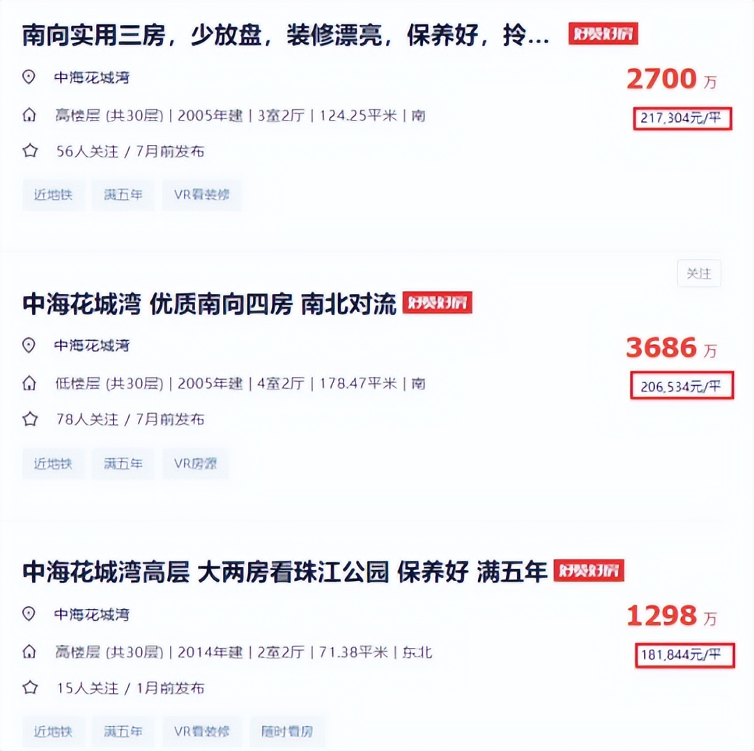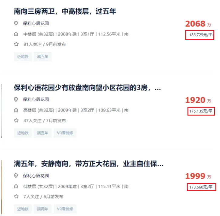 比如,保利心語的參考價是96957元/平方米,中海花城灣是92641元/平方米。而現在貝殼找房網站上可以看到,保利心語樓盤已經完全打破了參考價展示方式,比如下面三套房的單價分別為18.37萬元、17.51萬元、17.37萬元。