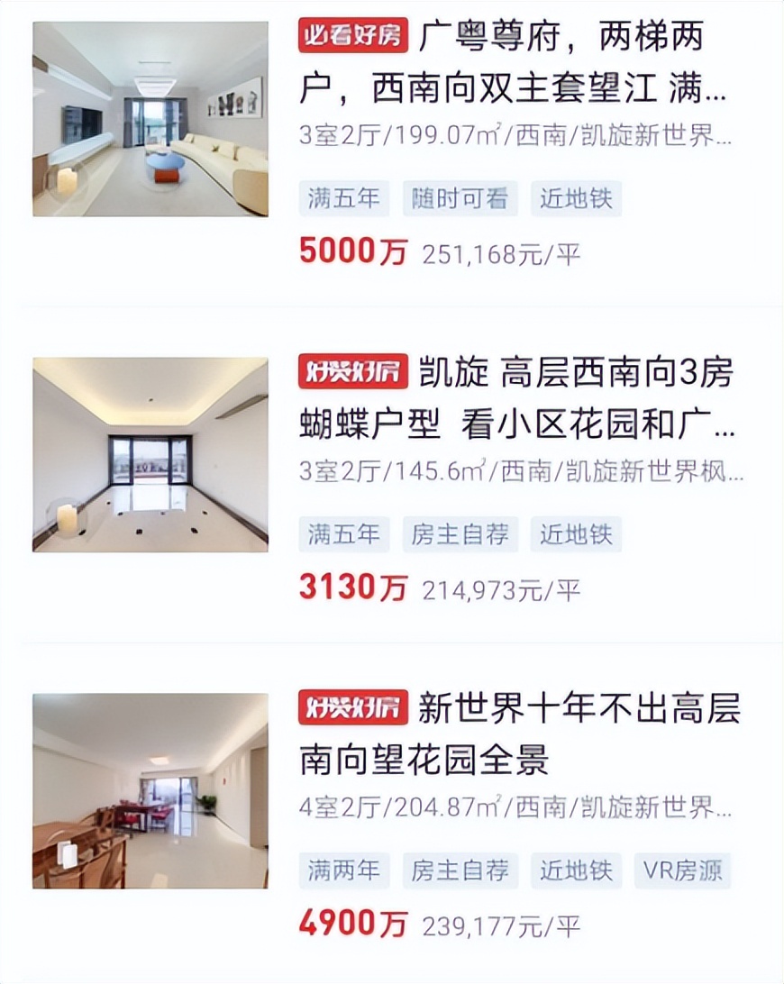 鏈家APP上凱旋新世界樓盤部分掛牌價,單價去到了21萬元到26萬元之間。