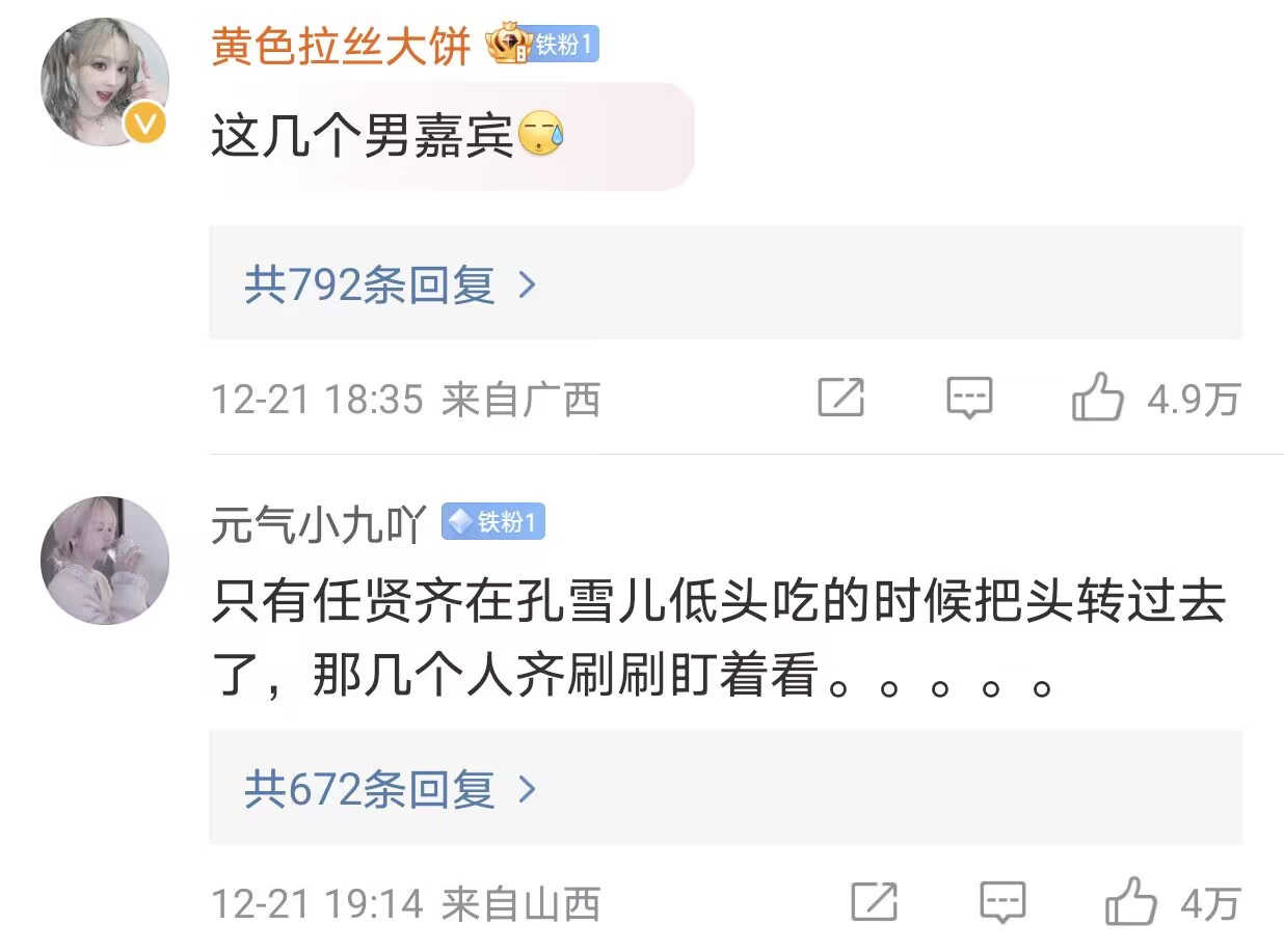 在場的男嘉賓看到這一幕就更樂了,第一時間説出來的一些話彷彿就是在嘲笑孔雪兒見識短。