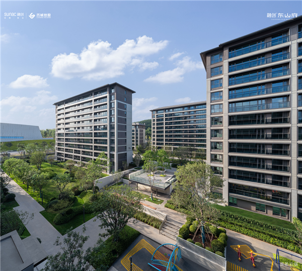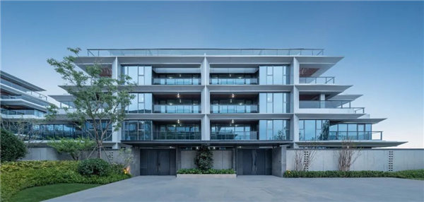 此次交付包含別墅和洋房兩種產品。不同於千篇一律、平庸化的建築形態,融創·東山府別墅產品,開創性地採用了“5+3”設計理念,即將邊户3層合院與中間5層疊墅融為一體,同時配合向外推展出的超大露台、並運用大面積藍色玻璃,邊户合院從高往低層層錯開,呈現出梯田狀的排列形式,遠遠望去,猶如一艘停泊于山林間的“藍水晶郵輪”,顯得格外耀眼,極具辨識度。