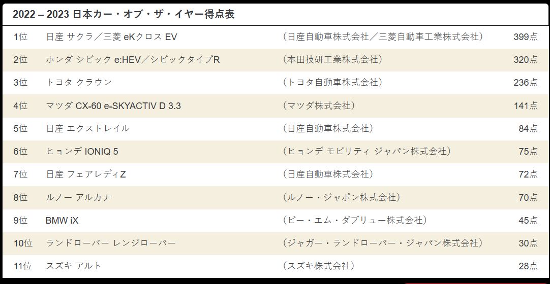 和去年相比,今年進入TOP10的電動汽車明顯增加,最終電動微型小車日產Sakura和三菱eK以399分的成績獲得了第一名。這也是繼去年日產Note獲得第一名之後,日產連續兩年斬獲最優秀獎項。再往前,日產獲得該獎項還是在2011年,獲獎車型是純電動汽車 LEAF(聆風)。