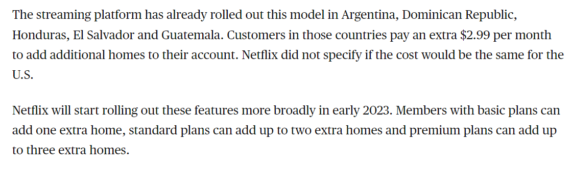 按照報道中的説法,現在網飛已經在一些拉美國家測試了密碼共享的附加支付政策,會額外收取約3美元。在這些國家,主要賬户所有者必須向家庭以外想要訪問該賬户的人提供一個驗證碼,網飛會反覆要求提供驗證碼,直到支付月費來增加非家庭用户。