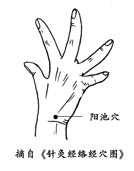 陝西省西安市中醫院推拿科主任醫師安軍明2016年在健康時報刊文指出,陽池,意味着囤聚太陽的熱量。陽池穴支配全身血液循環及荷爾蒙分泌的重要穴位,刺激這一穴位,可暢通血液循環,温和身體。手腳發冷的女性,一般只要堅持刺激陽池穴,便可不為冬天手冷發愁。⑪