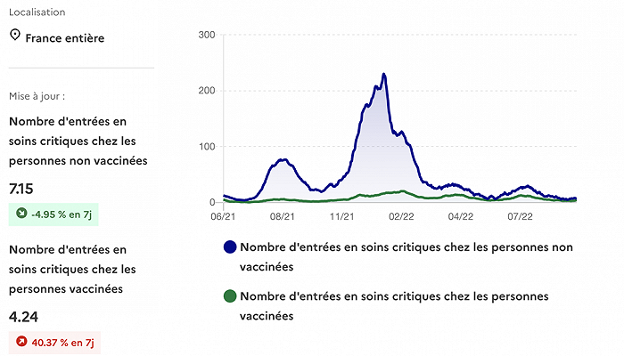 每百萬人因新冠入住重症監護病房比例。(藍色、綠色為疫苗接種羣體與非疫苗接種羣體)圖源:法國政府官網