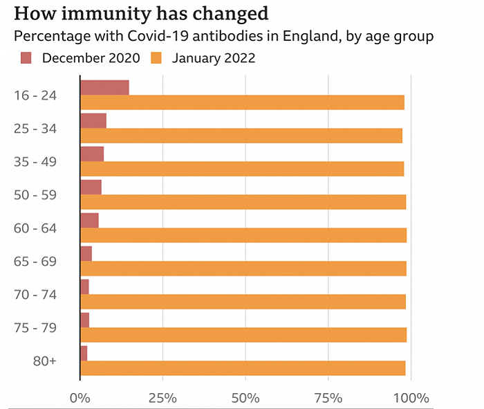 根據英國國家統計局的數據,早在今年1月,英格蘭地區各年齡段居民擁有新冠抗體的比例全部在97%以上。