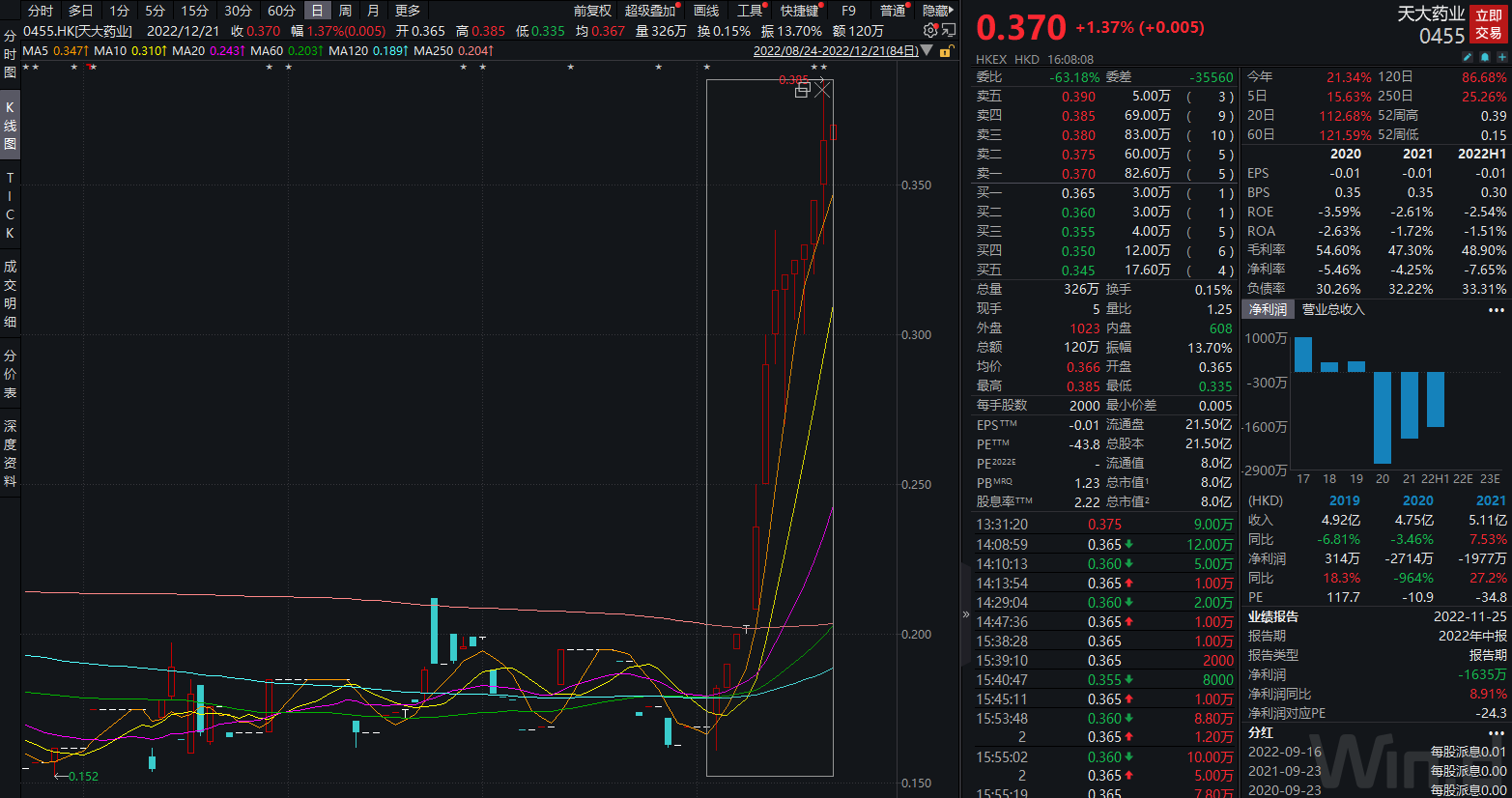 天大藥業作為當下疫情防控熱門概念股,近12個交易日,股價已實現118.93%的漲幅,無論從公司業務的整體發展還是從當前全國疫情防控的大環境來看,未來公司仍然具有很大的上漲空間。此前公司的抗高血壓藥物託平纈沙坦膠囊在全國集採中以第一順位中標,在國內同款產品中銷量第一,也充分證明了天大藥業在心腦血管領域的地位。股價快速實現翻倍不僅反映了投資者對防疫概念股的追捧,也從側面進一步體現了資本市場對公司未來成長空間與發展潛力的認可。