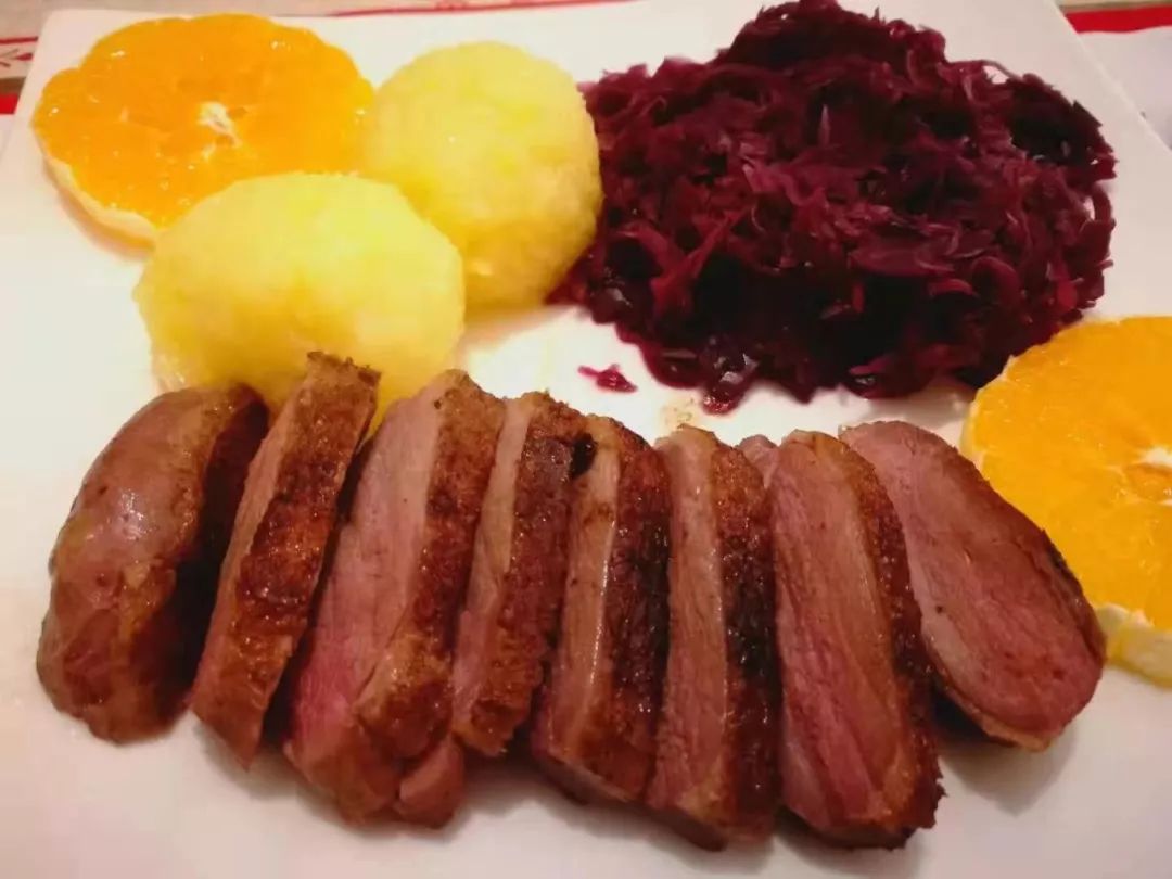 我家的自制聖誕晚餐,煎鴨胸肉燉土豆球配紫甘藍