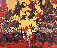 當我們到達科索沃,部隊待命出發時,軍官向我們發表演説:“兄弟們,我的孩子,我的兒子們!”他停頓了一下,“我們現在就站在埋葬着我們光榮的地方。我們向犧牲的祖先的英靈致敬……”他的聲音哽咽了,眼淚像流水一樣順着臉頰和灰白的鬍鬚落在地上……拉扎爾、米羅什,所有科索沃殉道者的亡魂都注視着我們。我們感到強大而驕傲……我們這一代人將實現整個民族好幾個世紀以來的夢想: 用我們的劍奪回失去的自由。