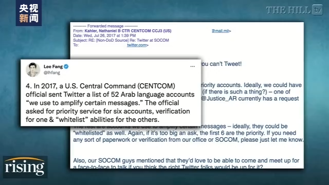 根據“截擊”網站獲得的文件,美國國防部與推特的合作至少可以追溯至5年前。2017年,美國國防部下屬的主要負責中東事務的中央司令部一位名叫納撒尼爾·卡勒的官員向推特方面發送郵件,要求推特對一批使用阿拉伯語發文社交的媒體賬户進行“解封”。