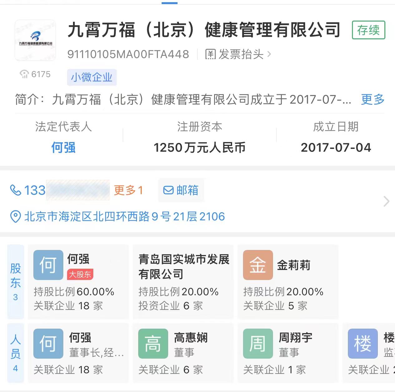 再來看一下這個防禦卡的生產方,九霄萬福(北京)健康管理有限公司。該公司成立於2017年,法定代表人何強,其經營範圍包括健康管理、技術開發、技術轉讓、醫療器械銷售等。其法人名下還有九霄萬福中醫研究院、九霄萬福生物科技研究中心。