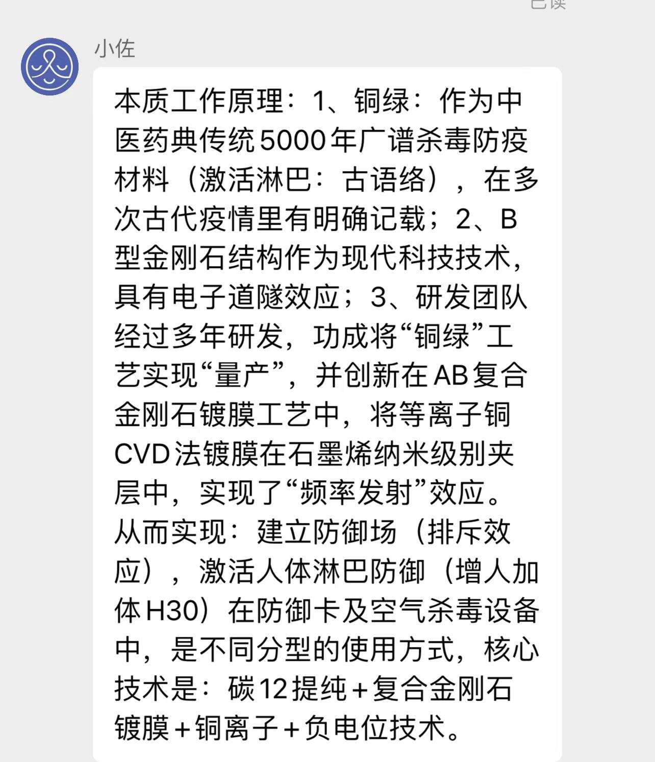 來,我們來看看到底是什麼樣的一張融合全球頂尖技術的神卡。根據一名網友的爆料,有微商在朋友圈和微信羣內正在推銷這款病毒防禦卡,稱這是朋友公司的病毒防禦卡,給小孩子佩戴一個,多一層防護多一份心安。隨後又對這張防禦卡的功能進行了解釋。推銷人員稱,卡片售價299元,團購可以優惠。