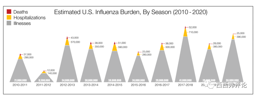 而美國的數據截然不同,從2010-2020年,美國每年流感感染人數 2000-4000萬人,死亡人數 12000-52000人,平均30000人。唯一一點相同之處就是 2020-2021年美國的流感也是歷史最低值,低到美國的CDC都沒去統計。