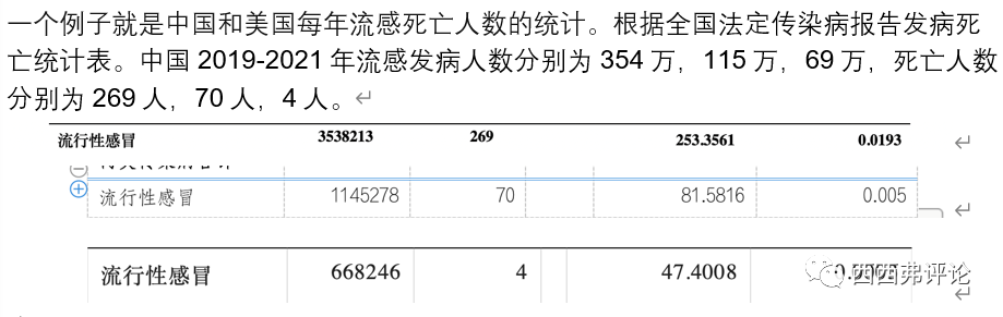一個例子就是中國和美國每年流感死亡人數的統計。根據全國法定傳染病報告發病死亡統計表。中國2019-2021年流感發病人數分別為 354萬,115萬,69萬,死亡人數分別為269人,70人,4人。