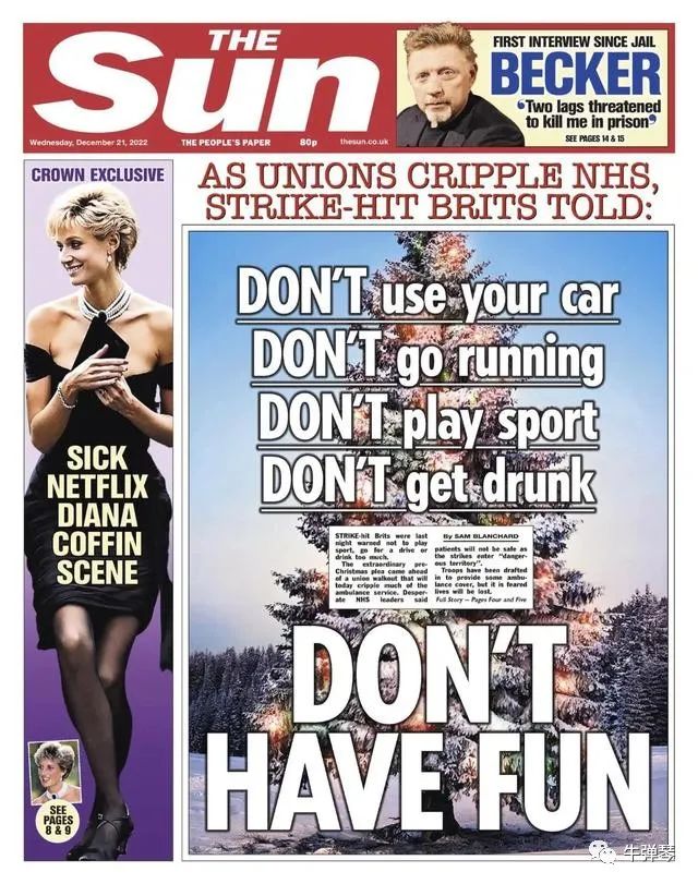 看到英國報紙的一個頭版:英國政府緊急提醒民眾,雖然聖誕節就要來了,但大家不要開車、不要跑步、不要運動、不要喝酒。簡言之,就不要尋任何開心。