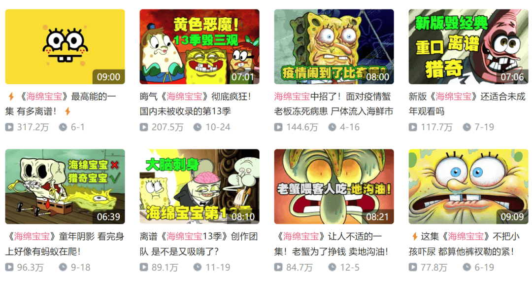 時過境遷,當年那批看着《海綿寶寶》長大的孩子們如今已長大成人。青春不再,童趣難尋,當大家想再度重温經典的時候,卻總能在互聯網上找到諸如“毀童年”之類的評價,似乎想要與自己的童年再續情緣,總會有這樣一個繞不開的話題:為什麼最近的《海綿寶寶》變得這麼獵奇?