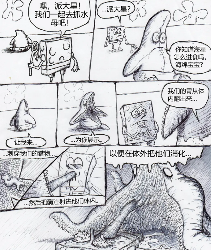 不僅是由官方出品的動畫,在粉絲們的二次創作中,以恐怖、壓抑為核心的作品同樣不勝枚舉。最為經典的莫過於兩年前曾風靡一時的粉絲作品《比奇堡恐怖故事》(又名“派大星的復仇”),漫畫借用原作角色為大家帶來了一段離奇曲折契合克蘇魯世界觀的邪典故事,其中“海綿寶寶你知道海星怎麼進食嗎?”這句極具衝擊力的台詞更是一度成為粉絲之間心領神會的“禁語”。