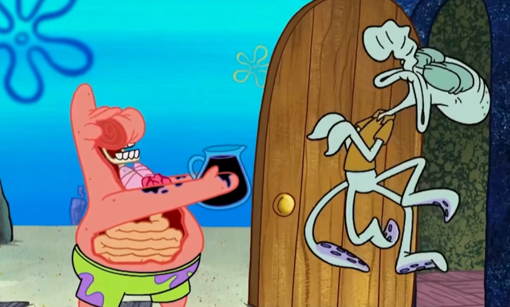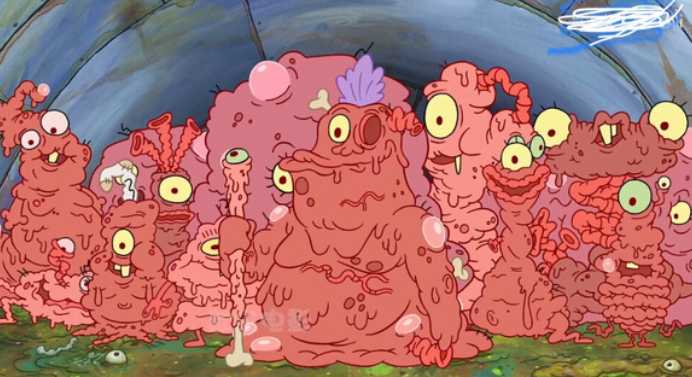 在後期的劇集裏,《海綿寶寶》的表現手法有所轉變,以往輕描淡寫僅作笑料的惡趣味畫面被拉長放大,刻意凸顯身體內部器官的比重增多,在某些特定的集數中隨手截取出來的片段都能讓人倒吸兩口冷氣,像是這副血肉橫飛的地獄景象,宛若動畫版的《沙耶之歌》。