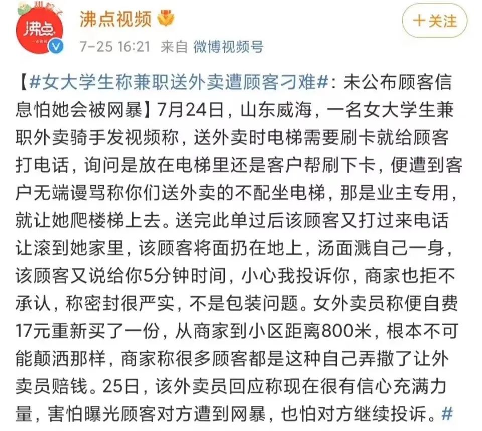 “你們送外賣的不配坐電梯”,外賣員爬完樓梯,對方更是看都不看就把外賣扔到地上,要求重新送。