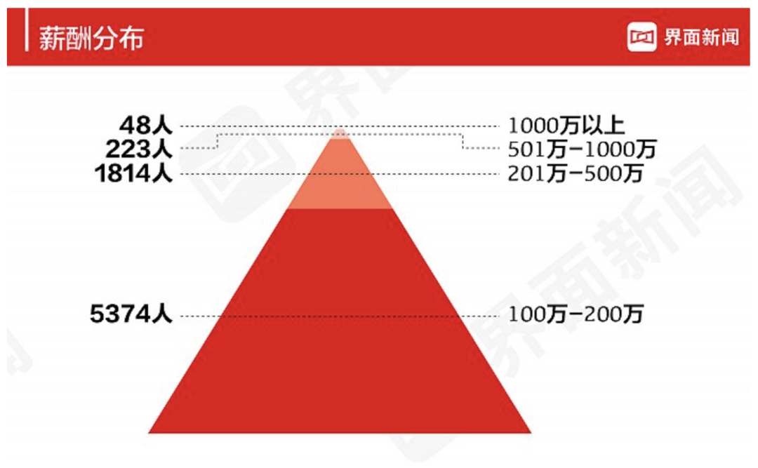 要知道,2020年界面新聞統計的上市公司高管薪酬榜單裏,72%的高管年薪也不過100-200萬。