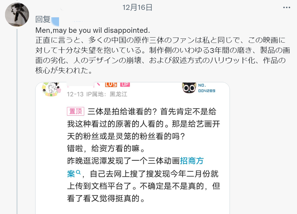 另一方面,《三體》動畫微妙的風評也在動搖海外粉絲的信心:如果連中國人自己都拍不好,那麼即將到來的網飛版會不會更糟?
