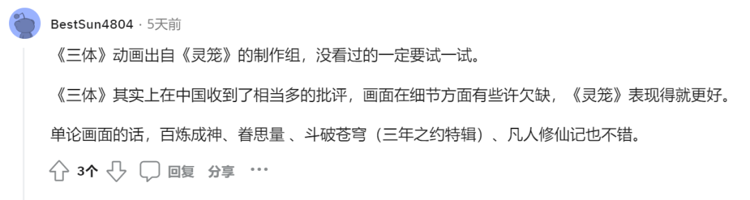 “三體”這個IP背後揹負的文化屬性讓動畫改編難如登天,觀眾想看到的是國產動畫的天花板,是中國科幻的再一次崛起。剝離了“國產”這一層特性,《三體》動畫在海外觀眾羣體裏可以得到更為中立,更為純粹的評價與判斷,就現狀而言,他們的語氣和評判標準的確與國內網友大相徑庭,但動畫在他們心中總歸還是差了口氣。
