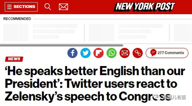 順便插一句題外話,此次澤連斯基的英語演講得到了美國網民的一致認可,他們認為這位烏克蘭領導人的英語演講能力遠遠超過了公開發言時口誤頻出的拜登總統。