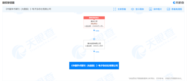 天眼查資料顯示,知網運營主體《中國學術期刊(光盤版)》電子雜誌社有限公司成立日期為1997年12月11日,實繳資本3000萬人民幣。公司疑似實際控制人為清華大學。