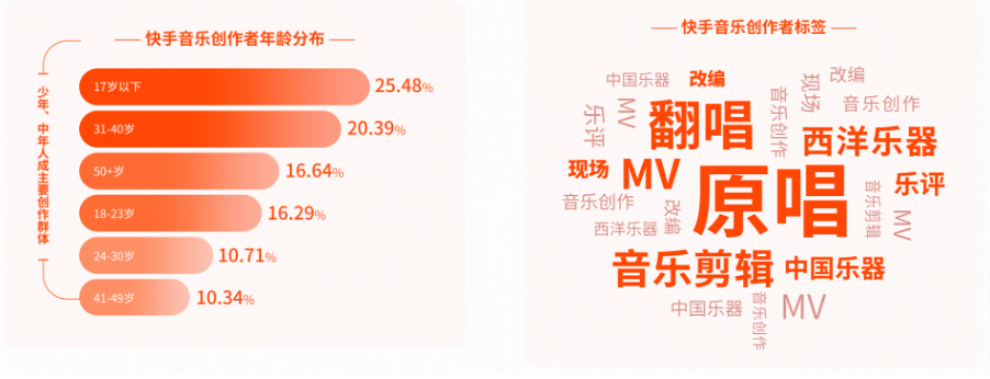 據《白皮書》統計,**2022年,快手音樂短視頻創作者整體規模同比增長21%,其中高粉創作者達到26萬;17歲以下創作者佔25.48%,31歲至40歲創作者佔20.39%,**少年及中年人成為主要創作羣體,原唱、翻唱、音樂剪輯等是他們的熱門創作標籤。