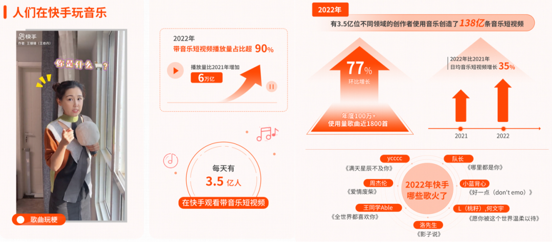 《白皮書》顯示,2022年,快手上每天有3.5億人在觀看帶音樂的短視頻,同時,有3.5億位不同領域的創作者使用音樂創造了138億條音樂短視頻,年度100萬+使用量歌曲近1800首,環比增長77%,日均音樂短視頻較2021年增長35%。