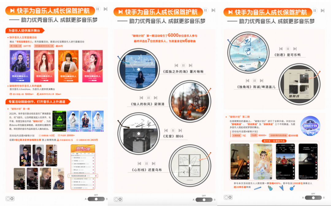 為了讓這些棲息在平台上的音樂人得到更好的成長,2022年,快手音樂先後推出了“尋找寶藏音樂人”、“破曉計劃”等音樂人選拔和扶持活動,從音樂發行、火歌宣發、舞台曝光等多維度發力,切實地為音樂人的成長保駕護航。