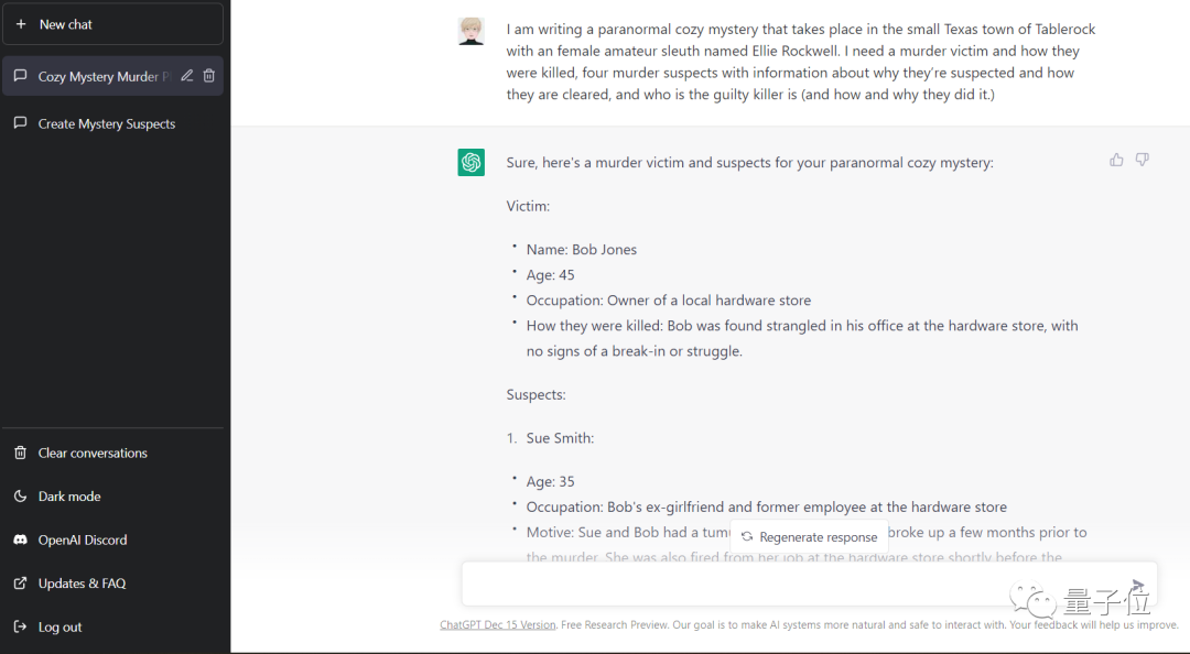 舉個例子,如果指明讓它寫一本輕鬆的推理小説,那麼ChatGPT給出的作案理由就不會特別沉重、血腥,犯人的名字也會偏向搞笑。