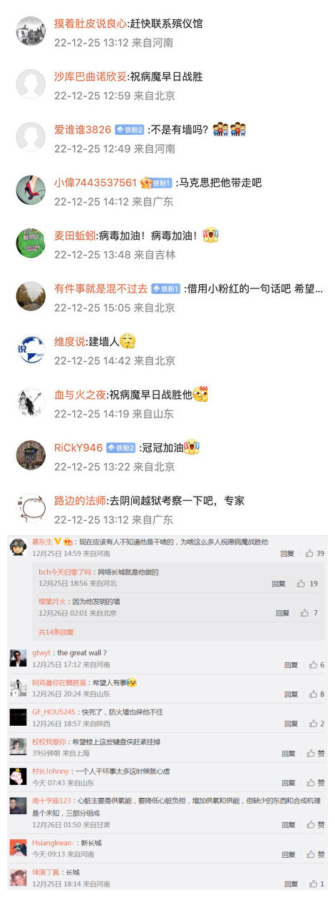 特別是其中的網友留言,“現在應該有人不知道他是幹啥的,為啥這麼多人祝願病魔戰勝他”,“一個人幹壞事太多就心虛”,“祝病魔早日戰勝”,“趕快聯繫殯儀館”,“去陰間越獄考察一下吧,專家”……等等咒語,令筆者丈二金剛——摸不着頭腦。