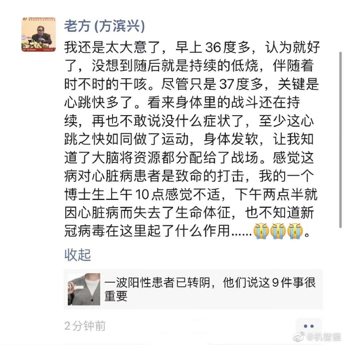 自從國家宣佈疫情防控開放那天起,我就自囚家中,時間長了便感到極度抑鬱,便想出去釣魚、逛逛街子市場。但家人制止,説如今敢在外頭四處躥的都是陽人……恰巧,偶然看到新浪微博25日掛出的“方濱興自曝染疫的消息”