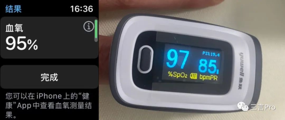 筆者在不同時間做了三次測試,測試發現,Apple Watch的檢測數據和指夾式血氧儀的數據不完全一致,但是兩者差別基本不大。