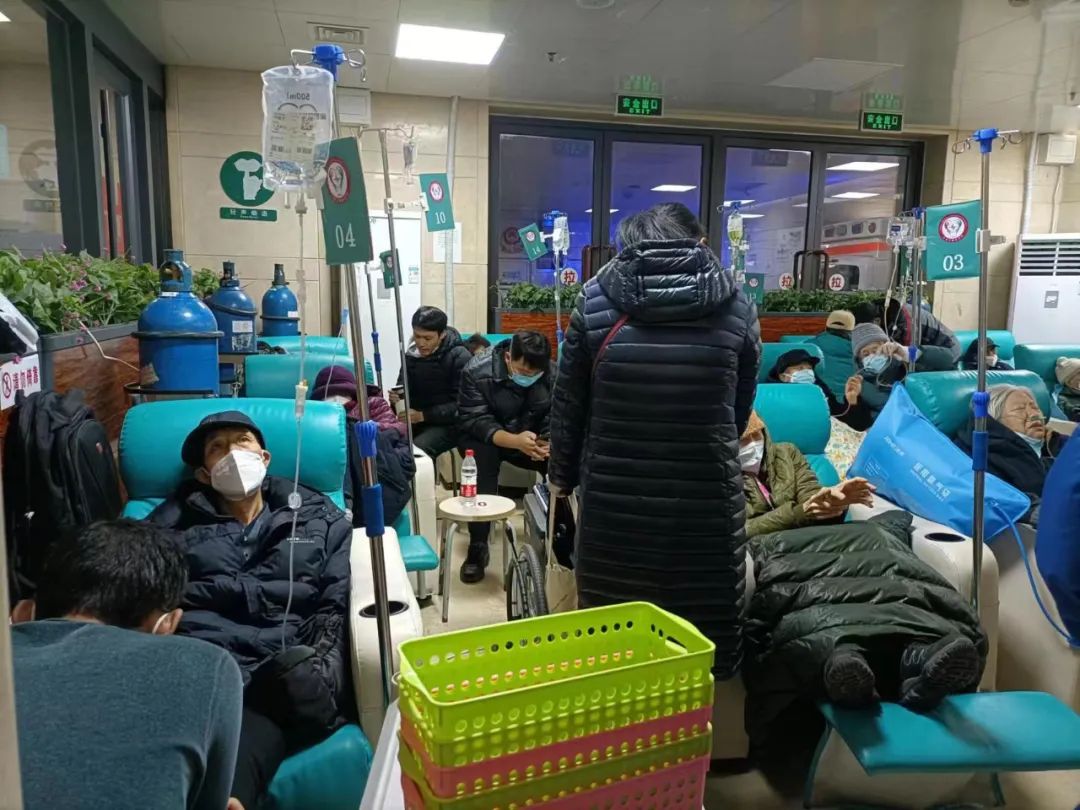與牀位同樣緊張的是急診室座位。平安夜凌晨4點,120把症狀加重的孫麗水送到北京市一家郊區醫院的急診。原本寬敞的過道里三層外三層擠滿了病人,留觀室50多個輸液座位坐滿後,加了十幾張平車和輪椅。