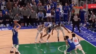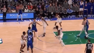 比如今天常規時間最後,達拉斯打一個盧卡右腰襲籃的邊線球戰術,這時鮑威爾和伍德同時在,跑了一個弧頂擋切:伍德經鮑威爾一個掩護到左底角,尼克斯必須跟這套路:於是盧卡舒服地籃下單打得手。