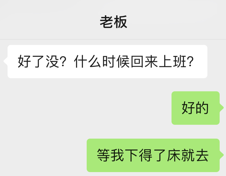 有時候大家也別怪老闆不懂你,你都病成這樣了還來打擾你。畢竟你不説,老闆永遠都不知道你能不能回來上班啊!從老闆的角度講,多一個人回來上班,公司確實就多一分人氣嘛!