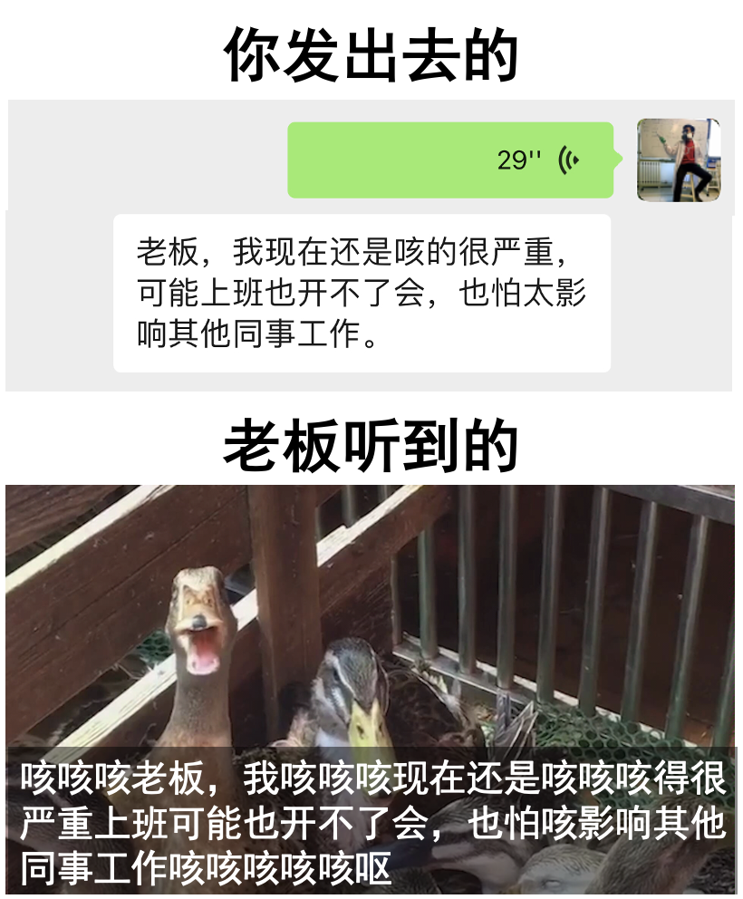 語音,往往比文字更有力量。老闆催你上班,你單純回覆一個“老闆,我現在嗓子咳得説不出話來”,老闆可能get不到你已經病得喪失基本語言能力。但如果你直接用微信語音一通狂咳,老闆可能就明白公司暫時不需要一隻會咳嗽的鴨子來上班