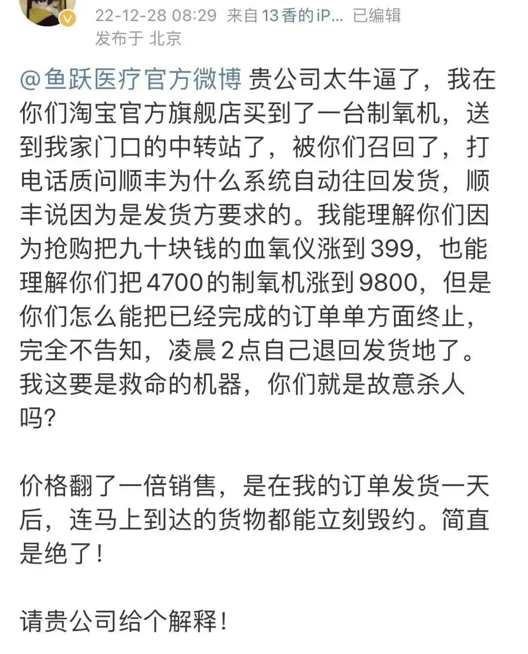 有網友購買了魚躍的製氧機之後,物流都已經到家門口了,又被髮貨方召回了。