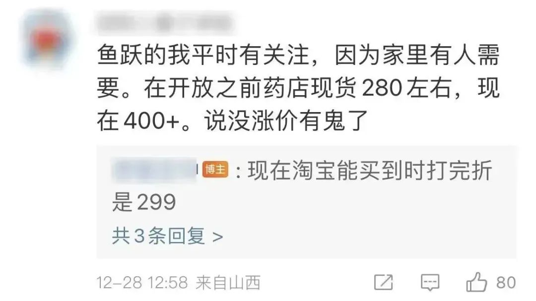 還有網友直接就噴了:**“説沒漲價有鬼了”。**家裏人有這個需求,放開之前,藥店現貨280,現在都要400+。