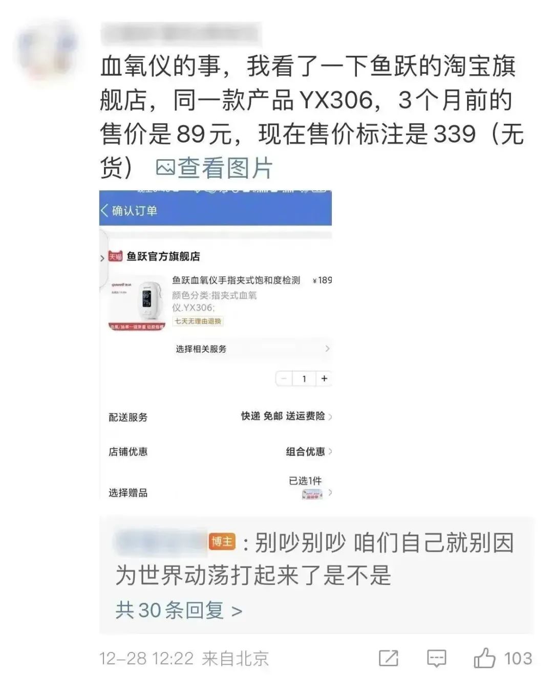 還有其他網友也發現,自己3個月之前購買的魚躍血氧儀是89塊錢,現在同款產品居然售價339還無貨!