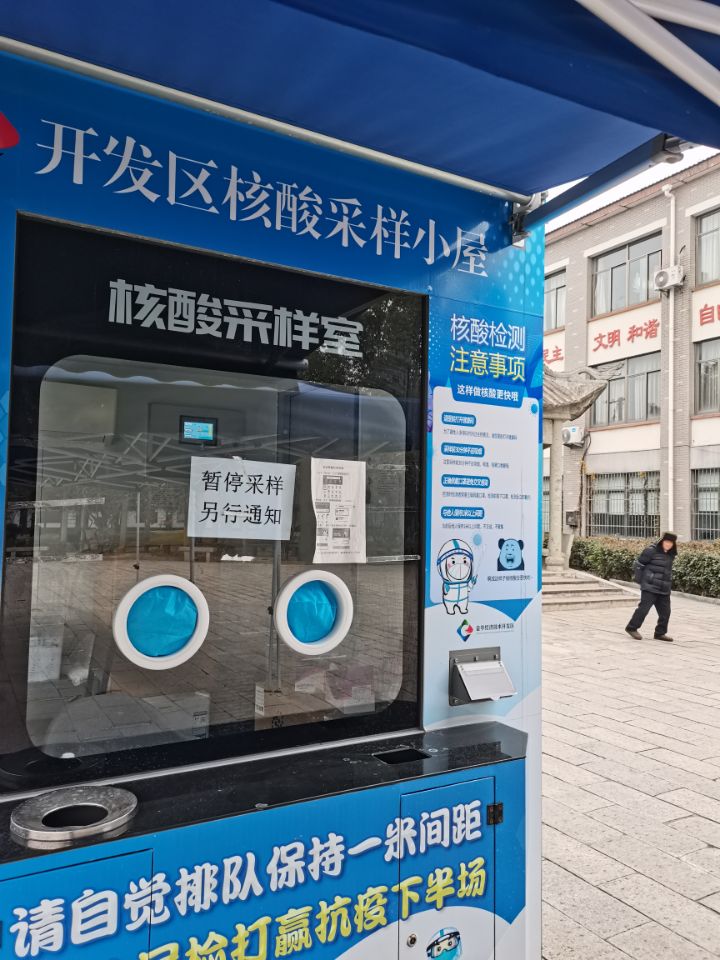 “核酸公園”的標誌性建築物是一間用來操作核酸採樣的小屋,過去一年裏,這間小屋兩側的四個採樣圓孔前幾乎日日排着長長、密密的人羣隊伍。昨天,再次路過此間,廣場已空曠無人,小屋窗外不知何時貼了一張“暫停”的白紙通知單。這裏按下“暫停”,社會生活則從此踏上回歸正常之路。