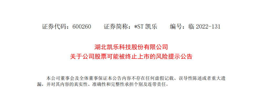 燈塔媒介12月28日訊,湖北凱樂科技股份有限公司(簡稱“*ST凱樂”,600260)12月28日發出《關於公司股票可能被終止上市的風險提示公告》,披露了公司可能觸及的幾種強制退市情形。
