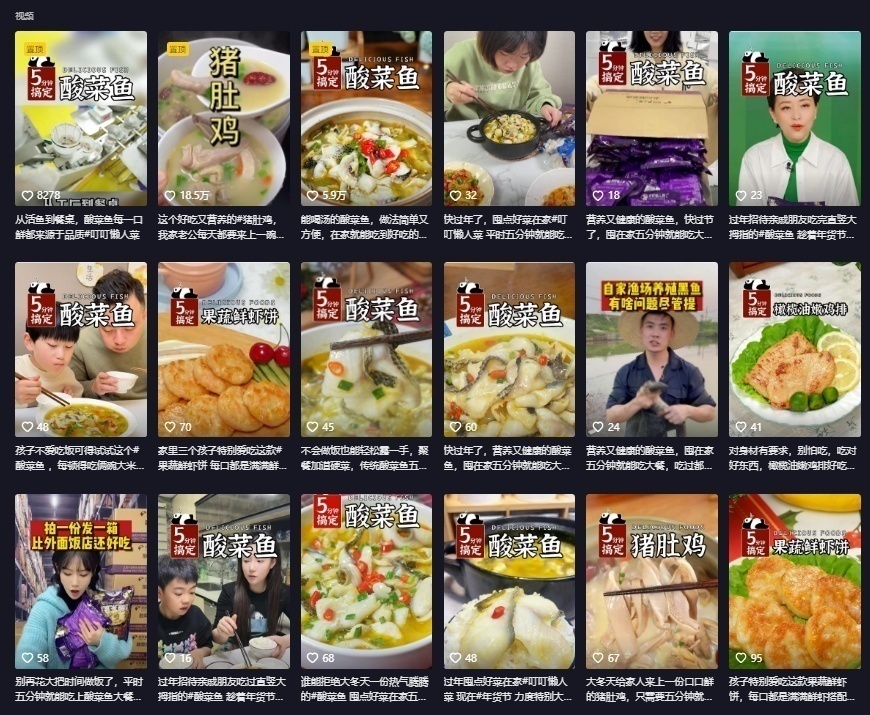 叮叮懶人菜官方旗艦店賬號顯示,叮叮懶人菜圍繞在家做飯場景,瞄準寶媽羣體,創作了大量酸菜魚相關的短視頻,如魚片加工流程的展示、酸菜魚開箱、家庭廚房內烹飪酸菜魚、家人一起吃酸菜魚、親朋聚餐吃酸菜魚……通過大量的短視頻內容種草,叮叮懶人菜將產品成功觸達更多消費者。