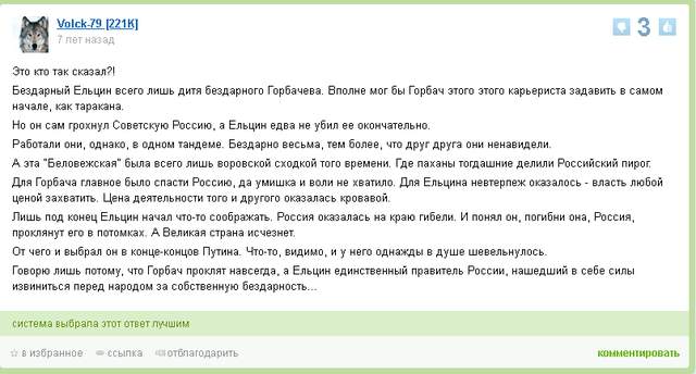 “沒有才華的葉利欽只是無能的戈爾巴喬夫的繼承者。戈爾巴喬夫本可以在一開始就粉碎葉利欽這個野心家,就像蟑螂一樣。