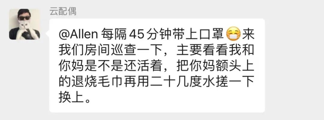 我們兩個渾身滾燙的中年人終於到了彼此謙遜、互不逞能的境界,我們卧牀不起,在退燒藥的作用下昏昏沉沉,睡也睡不着,醒也醒不了,但意識還挺清醒,孩子他爹給正在上網課的兒子發微信: