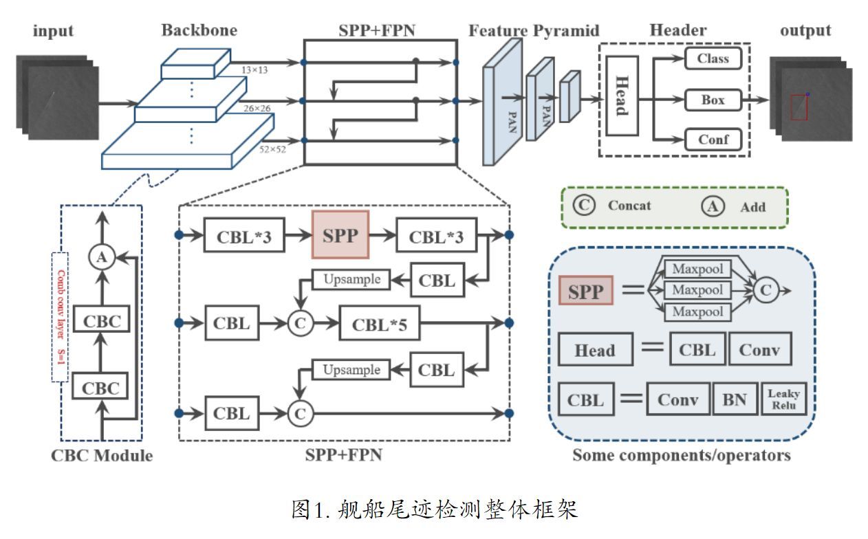 清華大學深圳國際研究生院周倩副教授、倪凱副教授課題組長期在微納光學技術、光譜成像技術、光電精密測量技術等領域進行研究工作,從特種光學元器件、整機系統研製到現場應用進行了全技術鏈條攻關。針對上述問題,周倩、倪凱課題組提出了一種新的輕量級深度學習模型,用於實時檢測艦船和尾跡。為了滿足巡航任務中艦船和尾跡檢測的實時性要求,本研究採用了單步法整體檢測框架(圖1),並開發了用於主幹特徵提取網絡的組合卷積模塊,以廉價的方式獲得豐富的特徵圖像,在大大減少模型訓練時間的同時也大大減輕了整體模型體積,滿足了艦船檢測系統的硬件要求。