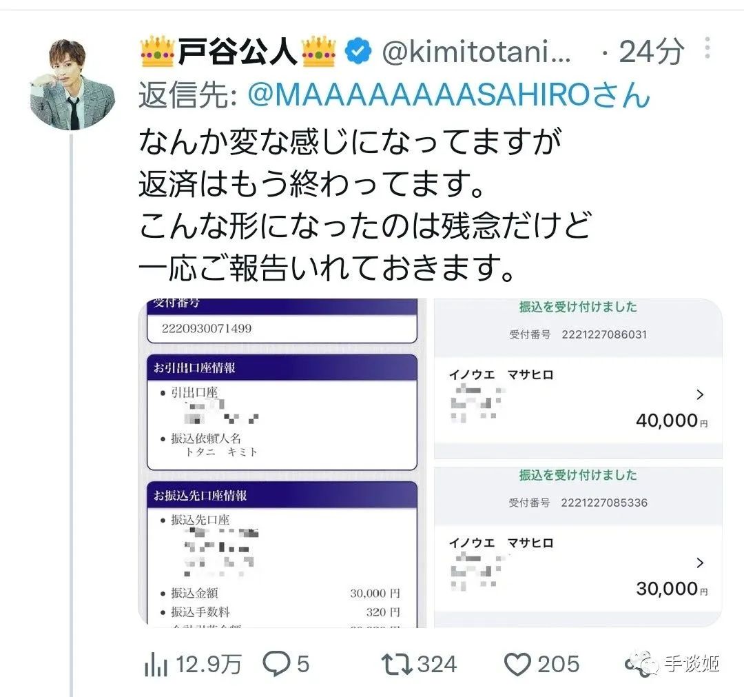 接着户谷就發了一個類似聲明的東西,説自己已經分期還款還完了,並表示自己給井上帶來很大麻煩深感抱歉。而井上也轉發了這個聲明,總之把錢還上就算結束了。