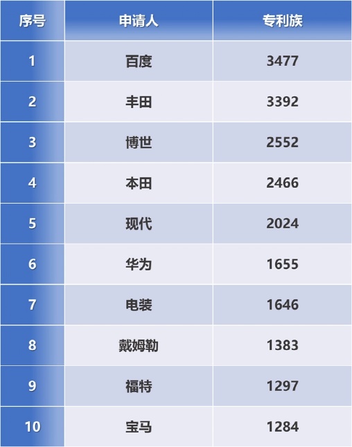 根據中國知識產權雜誌網站公佈的2022全球自動駕駛領域發明專利企業排名,百度公司以3477件的申請量居榜首,力壓全球第一大車企豐田和全球最大的汽配商博世。